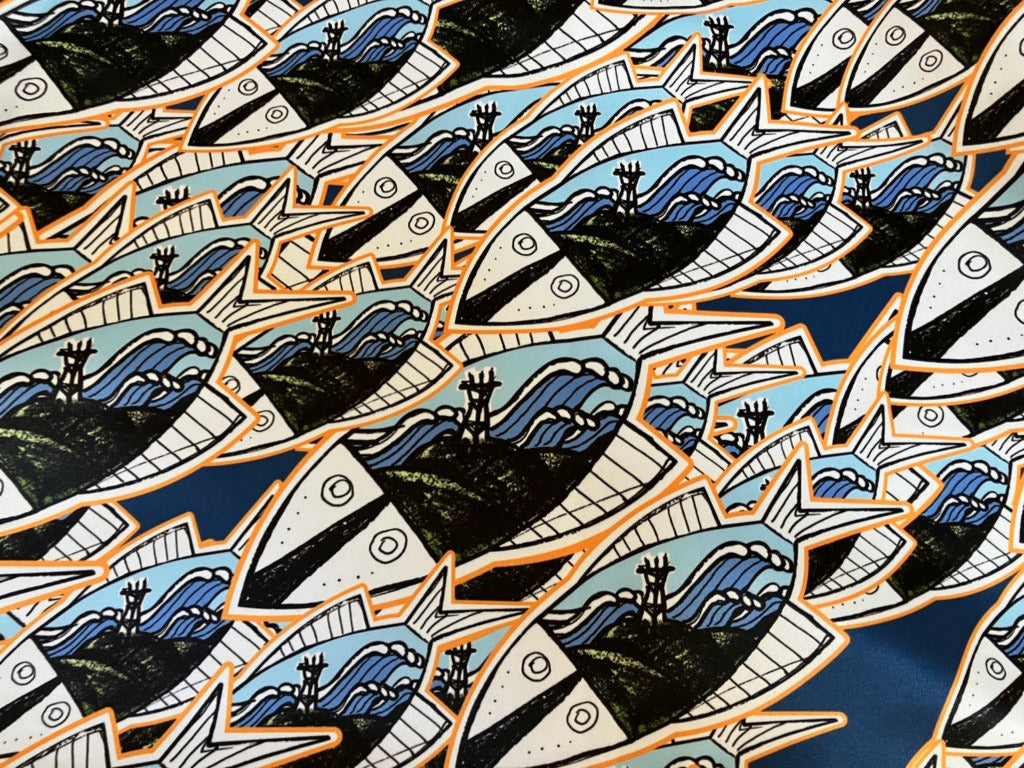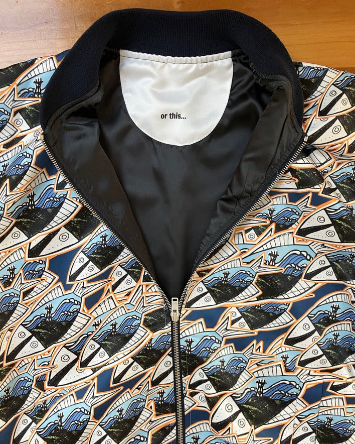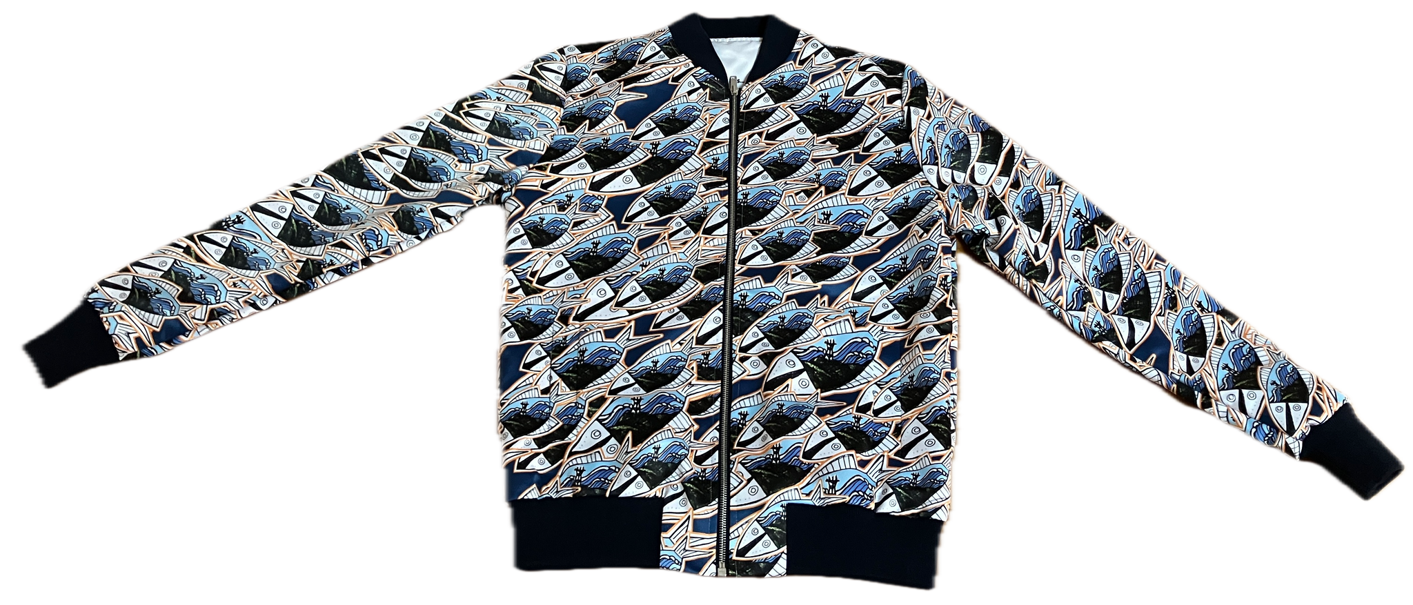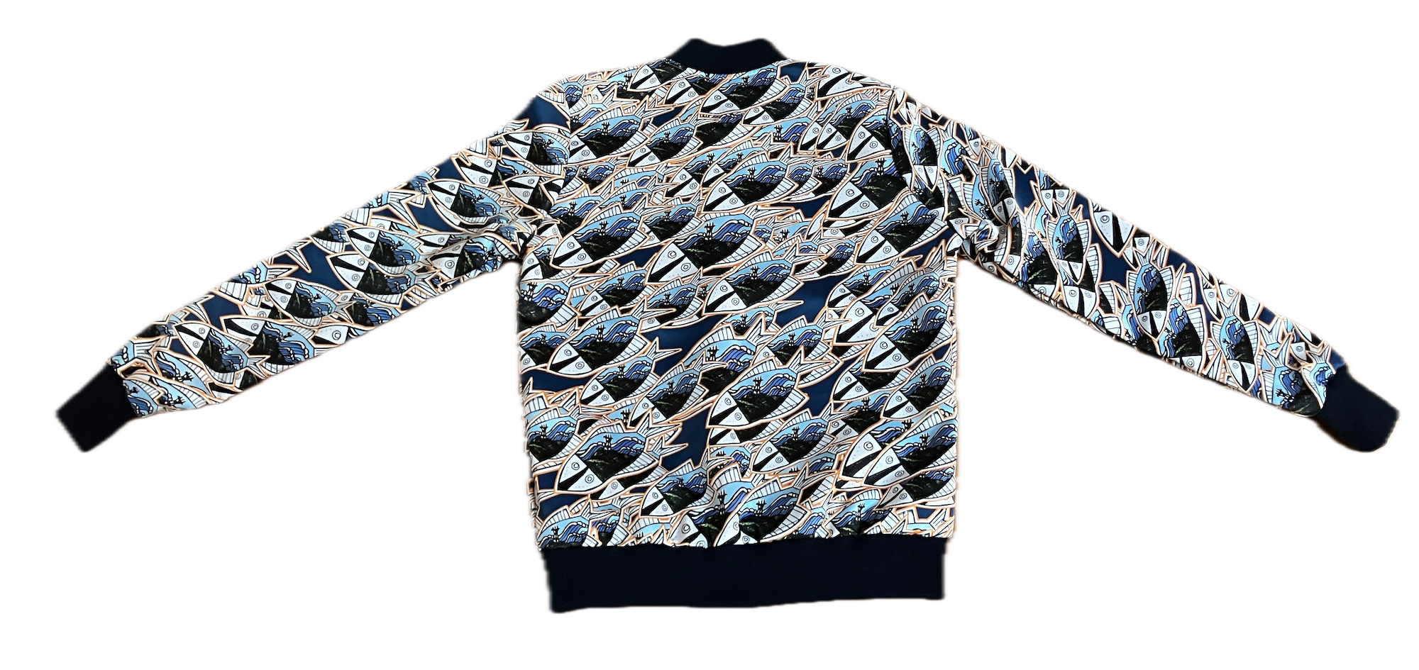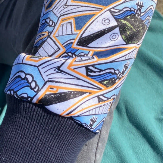 - Colors: fish is blue, black, and white with orange outline; cuffs are blue; lining is black